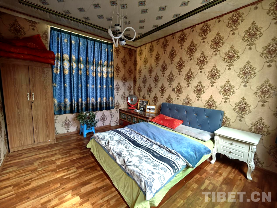 这处两层藏式民居,二层是家人整洁舒适的卧室,点缀着个性化的生活照片;一层是宽敞的客厅与厨房等,各类花卉绿植为室内增添了生机与温馨。整个居所干净明亮,与传统印象中的农居大不相同。